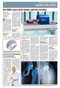 Die Hüfte muss nicht immer operiert werden Die Arthrose ist eine der häufigsten Erkrankungen der Hüfte. Ist die gelenkschützende Knorpelschicht zwischen Oberschenkelknochen und Beckenknochen verschlissen, reiben diese im Hüftgelenk aufeinander, nutzen sich ab und verformen sich. Die Folge davon sind starke Schmerzen und weitreichende Einschränkungen der Mobilität. Dr. Raimund Völker hat sich ausschließlich auf die Hüfte fokussiert und ist damit einer von wenigen hoch spezialisierten Experten für konservative und operative Maßnahmen an der Hüfte. Nicht-invasive Therapie Bei Arthrose, Osteoporose und bei Sportverletzungen ist eine Operation oft das letzte Mittel, um den Patienten bei Schmerz und körperlicher Beeinträchtigung zu helfen. Auch der Hüftspezialist Dr. Völker schöpft erst konservative Maßnahmen aus. Besonders erfolgreich ist hier die Kernspin-Resonanz-Therapie. Diese ist nicht-invasiv, nichtmedikamentös, seit Jahren ohne bekannte Neben- oder Wechselwirkungen erprobt und individuell auf den Patienten zugeschnitten. Je nach Diagnose sind sieben bis neun einstündige Sitzungen notwendig. Das Verfahren ist völlig schmerzfrei und aktiviert den körpereigenen Zellstoffwechsel, damit sich Knorpel und Knochengewebe selbst regenerieren können. Drei operative Verfahren Reichen konservative Maßnahmen nicht aus, stehen dem Operateur drei Verfahren für die Hüftendoprothetik, also den Ersatz der verschlissenen Knochenteile, zur Verfügung: die Totalendoprothese (TEP), die Kurzschaftprothese und der knochenschonende neue Oberflächenersatz. Das Implantat wird individuell zum Patienten passend ausgewählt. Totalendoprothese: Bei ausgedehnter Zerstörung des Knochens oder Osteoporose sind knochensparende Implantate langfristig nicht erfolgversprechend und damit zu riskant. Dann kommt nur eine Totalendoprothese infrage. Dabei wird ein stabiler Titanschaft tief im Oberschenkelknochen verankert. Auf dem Schaft sitzt ein Kugelkopf aus Keramik, der den Hüftkopf ersetzt und in der künstlichen Hüftpfanne gleitet. Die Operation wird minimalinvasiv unter größtmöglicher Schonung der Muskulatur durchgeführt, um die Genesung zu vereinfachen und zu beschleunigen. Kurzschaftprothese: Die Kurzschaftprothese zählt wie die Totalendoprothese zur Standard-Endoprothetik. Auch hier wird die Hüftpfanne im Becken ersetzt. Allerdings muss hier nur ein kleiner Teil des Schenkelhalses am Oberschenkelknochen entfernt werden. Der verbleibende Schenkelhals und der obere Teil des Oberschenkels reichen zur Verankerung des deutlich kürzeren Prothesenschaftes aus. Da versucht wird, möglichst viel Knochenmaterial zu erhalten, kann eine eventuelle Wechseloperation nach Jahren problemloser durchgeführt werden. Oberflächenersatz: Der Oberflächenersatz nach McMinn gilt als Teilprothese. Im Gegensatz zur Totalendoprothese und zur Kurzschaftprothese wird beim Oberflächenersatz nur die erkrankte Oberfläche des Hüftgelenks entfernt, Hüftkopf und Schenkelhals werden erhalten. Zur „Überkronung“ des Hüftkopfes wird herkömmlich eine Kappe aus einer Kobalt-Chrom-Metallverbindung aufgesetzt und jetzt – ganz neu – nun auch aus hochwertiger Keramik. Das neue Implantat ist besonders abriebfest. Diese knochenschonende Methode eignet sich vor allem für aktive, junge und junggebliebende Patienten unter 65 Jahren. Vorausgesetzt sind allerdings stabile Knochenverhältnisse im Kopf- und Halsbereich des Oberschenkelknochens ohne schwere Deformierung des Hüftkopfes. Die Vorteile des Oberflächenersatzes Der Oberflächenersatz ist ein Implantat, das die natürliche Größe des menschlichen Hüftgelenks nachahmt und so ein natürliches Bewegungsausmaß erlaubt. Die Gefahr des Auskugelns wird minimiert. Auch das Gelenkgefühl, die Reflexe sowie die Beinlänge und Hebelverhältnisse für die Hüftmuskulatur bleiben erhalten. Dadurch, dass nur der eigentliche Knorpelschaden ersetzt wird, werden die hüftnahen Anteile des Oberschenkelknochens maximal geschont, was bei einer gegebenenfalls notwendigen Wechseloperation Jahre später gute Voraussetzungen für alle Arten von Prothesenschäften schafft. Auch die Genesung verläuft in den meisten Fällen schneller als beim Standardverfahren mit Totalendoprothese und Kurzschaftprothese, was eine schnelle Rückkehr zu privater und beruflicher Aktivität einschließlich sportlicher Betätigung leichter gewährleistet. Mit dem Oberflächenersatz können Sportarten und Berufe ausgeübt werden, die mit Standardprothesen nicht mehr möglich oder sehr risikoreich sind. Zurück im Leistungssport Auch bekannte Leistungssportler wie etwa der ehemalige Tennisprofi Andy Murray waren nach dieser Methode weiter international erfolgreich. „Wir berichten stolz, dass wir aufgrund unserer Erfahrung die Ersten in Deutschland waren, die das neue Keramikimplantat erfolgreich eingesetzt haben“, sagt Dr. Völker. Weitere Informationen: www.hueftspezialist.de Experte Dr. med. Raimund Völker zu konservativer Therapie und ganz neuen Möglichkeiten bei Operationen Auf dem Röntgenbild wird der Unterschied sichtbar: Bei der Standard-Endoprothese (links) wird der Schaft tief im Oberschenkelknochen verankert, der Hüftkopf wird ausgetauscht. Beim Oberflächenersatz (rechts) wird der Hüftkopf überkront, der Knochen maximal geschont. Fotos: Dr. Völker Die Molekulare Biophysikalische Stimulation (MBST) ist eine konservative Option zur Operation. Fotos: Raimund Völker Der ReCerf©-Oberflächenersatz besteht aus leistungsstarker Keramik. Dies bietet entscheidende Vorteile für den Patienten. Grafik: MatOrtho SPITZENMEDIZIN IN DEUTSCHLAND Dr. med. Raimund Völker bietet neues OP-Verfahren an Dr. med. Raimund Völker, Leiter des Hüftzentrums und Mitgründer der ATOS Klinik München, gehört weltweit zu den erfahrensten Operateuren im Hüftoberflächenersatz. Deshalb wurde er für die Einführung eines neuen zukunftsweisenden Verfahrens in Deutschland ausgewählt. Beim Oberflächenersatz 