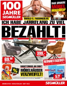 BEZAHLT! 360° drehbar Armlehnstuhl 69.99 Jahrhundert-Preis 119.-** 399.- Ausziehtisch Jahrhundert-Preis 599.-** Ausziehtisch „Palmdale“ Platte Keramik in schwarz, Gestell Metall schwarz pulverbeschichtet, Inkl. 2x Vorkopfauszug je ca. 40 cm B/H/T ca. 180(260)x76x90 cm 3668439 Armlehnstuhl „Riverside“ Bezug in Stoff anthrazit, beige, blau, grün, oder gold, Gestell Metall schwarz pulverbeschichtet inkl. Drehfunktion, 3727340 **Bisheriger Preis (mehr auf Seite 3) HARALD S. FASSUNGSLOS: MÖBELHÄUSER VERZWEIFELT! Alles dazu auf Seite 2 DAS GROSSE MÖBEL HOROSKOP ✂ REINHEITSGEBOT Jetzt sauber sparen mit unseren Spültabs ICH HABE JAHRELANG ZU VIEL drehbar Finish „Classic“ Geschirrspültabs, Tabs 100 Stück, 1 Tab = 0,0599 € 3798786 Abgabe nur in haushaltsüblichen Mengen. Symbolbild ausziehbar auf ca. 260 cm In der Möbelbranche tut sich was: Während Konkurrenten Woche für Woche in aufwändigen RabattSchlachten alles geben, zeigt SEGMÜLLER, dass es auch einfacher geht... mehr auf Seite 5 5. 99 Jahrhundert-Preis NUR SOLANGE VORRAT REICHT! je RABATTZIRKUS AM ENDE?
