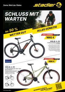 498 € UVP 699 € 201 € SPAREN Deine Welt der Räder. 22x in Deiner Nähe. Aktion bis zum 23. April, nur solange der Vorrat reicht 1692 € UVP 3399 € 1707 € SPAREN Allround-E-Bike für Alltag und Trailspaß | superstarker Bosch Performance CX Motor | Bosch Flow-App für Steuerung von Navifunktion, Diebstahlschutz und zukunfts- sicheren Updates | MonkeyLink-Schnittstellen für sekundenschnelles Lichtupgrade | leichter und schnell mitnehmbarer 545 Wh Bosch Akku | viele Größen bis 60 cm | Art.-Nr.: 126638 LT CX 545 E-Mountainbike 27.5/29“ Performance CX 85 Nm | 545 Wh Mountainbike mit StVZO-Straßenausstattung 21 Gang Shimano Schaltung | solide Sportschutzbleche | Seitenständer | LED- Nabendynamo-Licht | viele Größen ab 5 bis 18 Jahren | Art.-Nr.: 134586 Hannah & Wildstreet Mountainbike 26“ | 27.5“ | 29“ Art.-Nr.: 134579 Wildstreet dunkelblau Art.-Nr.: 134601 Hannah mint SCANNEN & DEALS ONLINE SICHERN zweirad-stadler.de ALLES GÜNSTIG WETTER GUT BIS 50 %