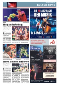 17. MAI 2026 MÜNCHEN - OLYMPIAHALLE United Promoters AG PRESENTS Special Guest: Andy Fairweather Low OIMARA MIT BANDE EDMUND · RIAN MENZL XXL – DIE WIESNBESETZUNG SHANTEL & BUCOVINA CLUB SOUNDSYSTEM GLOBAL KRYNER · TOM & BASTI · DIE FEXER · UVM. ALLE INFOS & TICKETS UNTER: BRASSWIESN.DE 5BÜHNEN 70+BANDS 30. JULI - 02. AUGUST 2026 FESTIVAL DAHOAM BRASS WIESN München, Brunnenhof der Residenz 04. August 2026, Beginn 20.00 Uhr Landshut, Burg Trausnitz 05. August 2026, Beginn 19.00 Uhr Einlass: eine Stunde vor Vorstellungsbeginn VVK: alle bekannten Vorverkaufsstellen www.muenchenticket.de KULTURTIPPS ANZEIGE VERANSTALTUNGEN Hochkarätige Live-Musik Der Trompeter Rüdiger Baldauf ist der kreative Kopf der „Trumpet Night“, mit der er regelmäßig zu einem Treffen der Stars der Musikszene einlädt. Am 22. Mai präsentiert er als Special Guest den deutschen Songwriter, Pop- und Soulsänger Max Mutzke. Dabei zeigt Gastgeber Baldauf seine Vielseitigkeit, indem er Songs von Mutzke an das Line-up anpasst und neu arrangiert. Das Ergebnis ist eine Fusion aus künstlerischem Können und musikalischer Leidenschaft. Bei alldem ist die „Trumpet Night“ nie allein ein Showcase für den Solisten auf der Bühne: Sie wird von einer hochkarätig besetzten, siebenköpfigen und äußerst facettenreichen Band begleitet. Weitere Informationen: Freitag, 22. Mai, 20 Uhr, Bürgerhaus Unterschleißheim, Tickets: forum-unterschleissheim.de und muenchenticket.de sowie ☎08931009200 „Trumpet Night“ am 22. Mai mit Rüdiger Baldauf und Max Mutzke in Unterschleißheim Die Band der „Trumpet Night“ Foto: Simon Engelbert Special Guest Max Mutzke Foto: Dirk Messner Auf dem Weg zum Stall Immer dem Stern nach – mit Gottvertrauen!“ Mit dieser Wegbeschreibung nach Bethlehem kann der Besenbinder Peter (Roland Schreglmann) wenig anfangen. Bis ihm ein Licht aufgeht. Das „Münchner Weihnachtssingen Heilige Nacht“ ist vom 9. bis 15. Dezember wieder in der Allerheiligen-Hofkirche der Residenz zu erleben. Für einige Vorstellungen der Inszenierung von und mit Enrico de Paruta gibt es nur noch Restkarten. Deshalb früh Tickets sichern. Weitere Informationen: Karten gibt es bei muenchenticket.de und unter heilige-nacht.com Von 9. bis 15. Dezember wieder das „Münchner Weihnachtssingen Heilige Nacht“ von und mit Enrico de Paruta erleben Enrico de Paruta und Roland Schreglmann Foto: Oliver Bodmer Chopin neu interpretiert Hardy Rittners Buch „Chopins vergessene Cantilene“, eine „große Bereicherung“ für Chopinliebhaber und „Pflichtlektüre“ für Pianisten (so BR-Klassik), bildet den Hintergrund für seine zweite Konzerttournee, die am 26. und 27. Mai in Stuttgart und München beginnt. Auf einem kostbaren originalen Pleyel-Flügel von 1846 spielt Rittner in seiner introvertiert-expressivenArt unter anderem Etüden, Mazurken und das berühmte Fantaisie-Impromptu op. 66 in gesanglich geprägter Interpretation. Besonderen Wert legt Rittner darauf, dem Publikum seine Erkenntnisse zu „Chopins vergessener Cantilene“ prägnant zu erläutern und anhand von Klangbeispielen zu veranschaulichen. Weitere Informationen: „Chopins vergessene Cantilene“ am 27. Mai im Münchner Künstlerhaus, hardyrittner.com Recital und Gespräch mit Hardy Rittner am 27. Mai im Münchner Künstlerhaus Hardy Rittner kommt am 27. Mai um 20 Uhr ins Münchner Künstlerhaus. Foto: Frances Marshall Ganz großes Kino erleben Zwei Münchner Kulturmarken, die weit über die Stadtgrenzen hinaus strahlen, machen gemeinsame Sache: das Deutsche Theater und das „DOK.fest München“. Für kurze Zeit verwandelt sich das Theater in der Schwanthalerstraße wieder in das größte Kino derStadt. Und bietet den perfekten Rahmen für die Eröffnungsfeier am 6. Mai. Gezeigt wird der Film „Ingeborg Bachmann – Jemand der ich einmal war“. Bis 10. Mai folgen acht weitere Filmpremieren. Weitere Informationen: deutsches-theater.de/dokfest Das „DOK.fest München“ startet am 6. Mai mit einer Eröffnungsfeier im Deutschen Theater