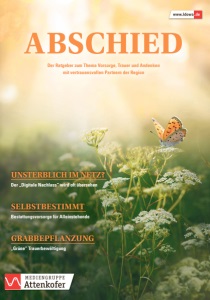 ABSCHIED Der Ratgeber zum Thema Vorsorge, Trauer und Andenken mit vertrauensvollen Partnern der Region UNSTERBLICH IM NETZ? SELBSTBESTIMMT GRABBEPFLANZUNG Der „Digitale Nachlass“ wird oft übersehen Bestattungsvorsorge für Alleinstehende „Grüne“ Trauerbewältigung