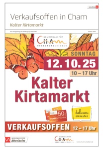 Eine Verlagsbeilage der Mediengruppe Attenkofer Oktober 2025 www.cham-erleben.de VERKAUFSOFFEN 12 – 17Uhr Kalter Kirtamarkt 12.10.25 SONNTAG 10–17Uhr Verkaufsoffen in Cham Kalter Kirtamarkt