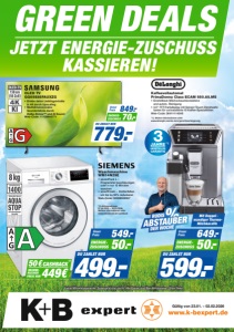 Unser Preis 549.- 499.- DU ZAHLST NUR 50.- ENERGIEZUSCHUSS 50€ 449€ CASHBACK *2 RECHNERISCHER PREISNUR Waschmaschine WM14N29E • speedPack L – Programme beschleunigen oder in nur 15 Minuten waschen • smartFinish – Knitterfalten um bis zu 50% reduzieren Web-Code: 32008302057 *2) Aktionszeitraum: 01.09.2025 – 28.02.2026. Weitere Informationen unter www.extraklasse.de/cashback Ohne Deko Unser Preis 649.- 599.- DU ZAHLST NUR 50.- ENERGIEZUSCHUSS Kaffeevollautomat PrimaDonna Class ECAM 550.85.MS • Einstellbare Milchschaumkonsistenz und autom. Reinigung • 3,5‘‘-TFT-Farbdisplay mit Sensor-Touch-Direktwahltasten für vorinstallierte 15 Kaffee-Spezialitäten Web-Code: 36411114248 *1) Weitere Informationen unter www.delonghi.com/de-de/e/garantieverlangerung Mit Doppelwandiger ThermoMilchkaraffe *1 OLEDTV GQ55S85FAUXZG • Erlebe deine Lieblingsinhalte in 4K durch Upscaling • Multidimensionales Sounderlebnis durch Dolby Atmos™ und AI Sound Web-Code: 11128946771 KI 779.- Unser Preis DU ZAHLST NUR 70.- 849.- ENERGIEZUSCHUSS Keine Mitnahmegarantie. Solange Vorrat reicht. Alle Preise sind Bar-Abholpreise. Ohne Deko. www.k-bexpert.de Gültig von 23.01. – 02.02.2026 GREEN DEALS KASSIEREN! JETZT ENERGIE-ZUSCHUSS