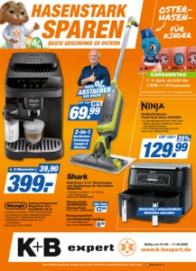 Keine Mitnahmegarantie. Solange Vorrat reicht. Alle Preise sind Bar-Abholpreise. Ohne Deko. www.k-bexpert.de Gültig von 01.04. – 11.04.2026 F Infos auf S. 4 SPAREN HASENSTARK BESTE GESCHENKE ZU OSTERN Kaffeevollautomat Magnifica Evo ECAM293.52.B 399.- F 10 Monatsraten à 39,90 • OneTouch-Funktion, 4 Soft-Touch-Symbole • x2-Funktion für einen doppelten Espresso • Cappuccino, Heißwasserzubereitung • Einstellbare Kaffeetemperatur und Kaffeestärke Web-Code: 36411126248 Kabelloser 2-in1 Staubsauger und Sprühmopp für Hartböden VM200EU • Kabellos und leicht – nur 1,91 kg • 0,35 l Wassertank Web-Code: 36250004928 Reinigungsmittel 1267NU2900XEU VacMop • 2 L Nachfüllflasche Web-Code: 36290008928 9.99 Wischaufsatz 1832HK200EU Einweg-Pads Web-Code: 36290006928 17.99 16er Pack 69.99 UVP129.99 46% 2-in-1 HartbodenReinigung: Saugen& Wischen 4. April, ab 9:00 Uhr KARSAMSTAG Fachmarkt Heißluftfritteuse Foodi Dual Zone AF300EU • 6 Zubereitungsfunktionen: Max Crisp, Braten, Backen, Aufwärmen, Dörren und Heißluft-Frittieren • 7,6 l Fassungsvermögen (2x 3,8 l) Web-Code: 36463001928 Gleichzeitig 2 unterschiedliche Mahlzeiten zubereiten 129.99 UVP199.99 35% OSTERHASENFÜR KINDER Nur solange Vorrat reicht – nur 1 Osterhase pro Kind.